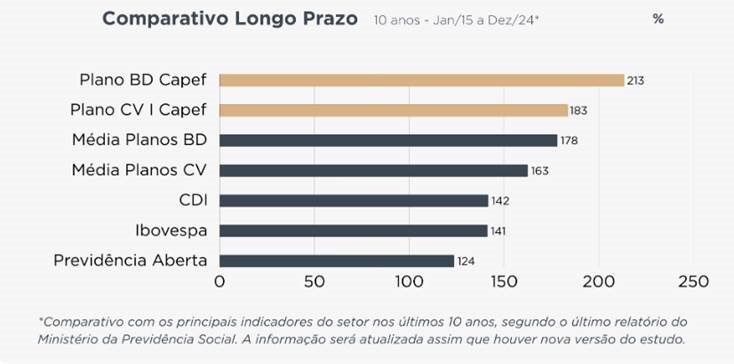 Entre janeiro de 2015 e dezembro de 2024, o Plano BD Capef acumulou 213% de rentabilidade, e o Plano CV I Capef, 183%, resultados bem acima das médias do setor (178% e 163%, respectivamente) e de referências como o CDI (142%), o Ibovespa (141%) e a Previdência Aberta (124%).