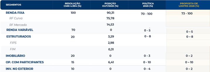 Na sequência, o Gerente de Investimentos, Marcelo D’Agostino, apresentou as premissas macroeconômicas consideradas para 2026 e as propostas de macrolocação dos ativos para os três planos, com intervalos de alocação em renda fixa, renda variável, investimentos estruturados, imóveis, operações com Participantes e investimentos no exterior.